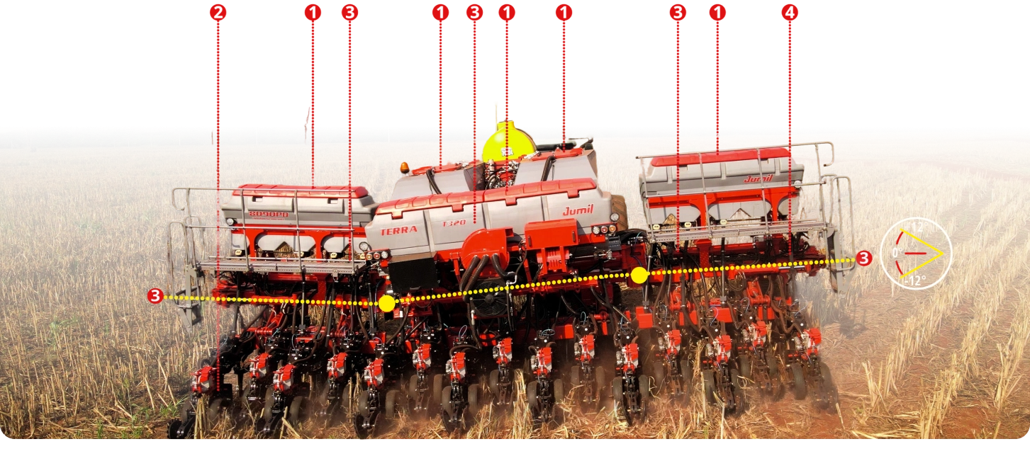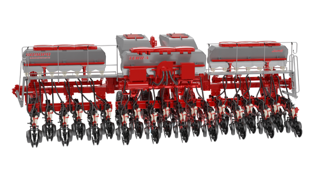 Para um rendimento operacional otimizado, conta com o depósito central de sementes pressurizado agilizando o abastecimento e depósito longitudinal de fertilizantes que otimiza a distribuição de peso e aumenta o poder de corte da máquina para um plantio de alta qualidade garantindo profundidade e singularidade uniforme das sementes de ponta a ponta.