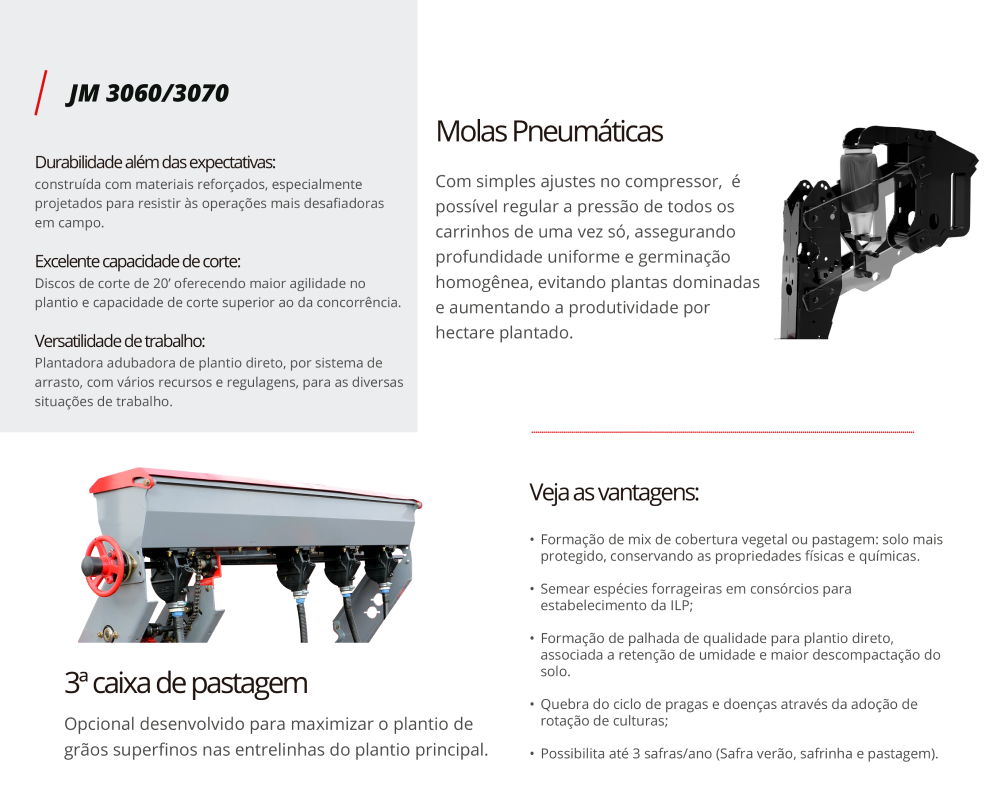 Versatilidade de trabalho: Plantadora adubadora de plantio direto, por sistema de arrasto, com vários recursos e regulagens, para as diversas situações de trabalho.