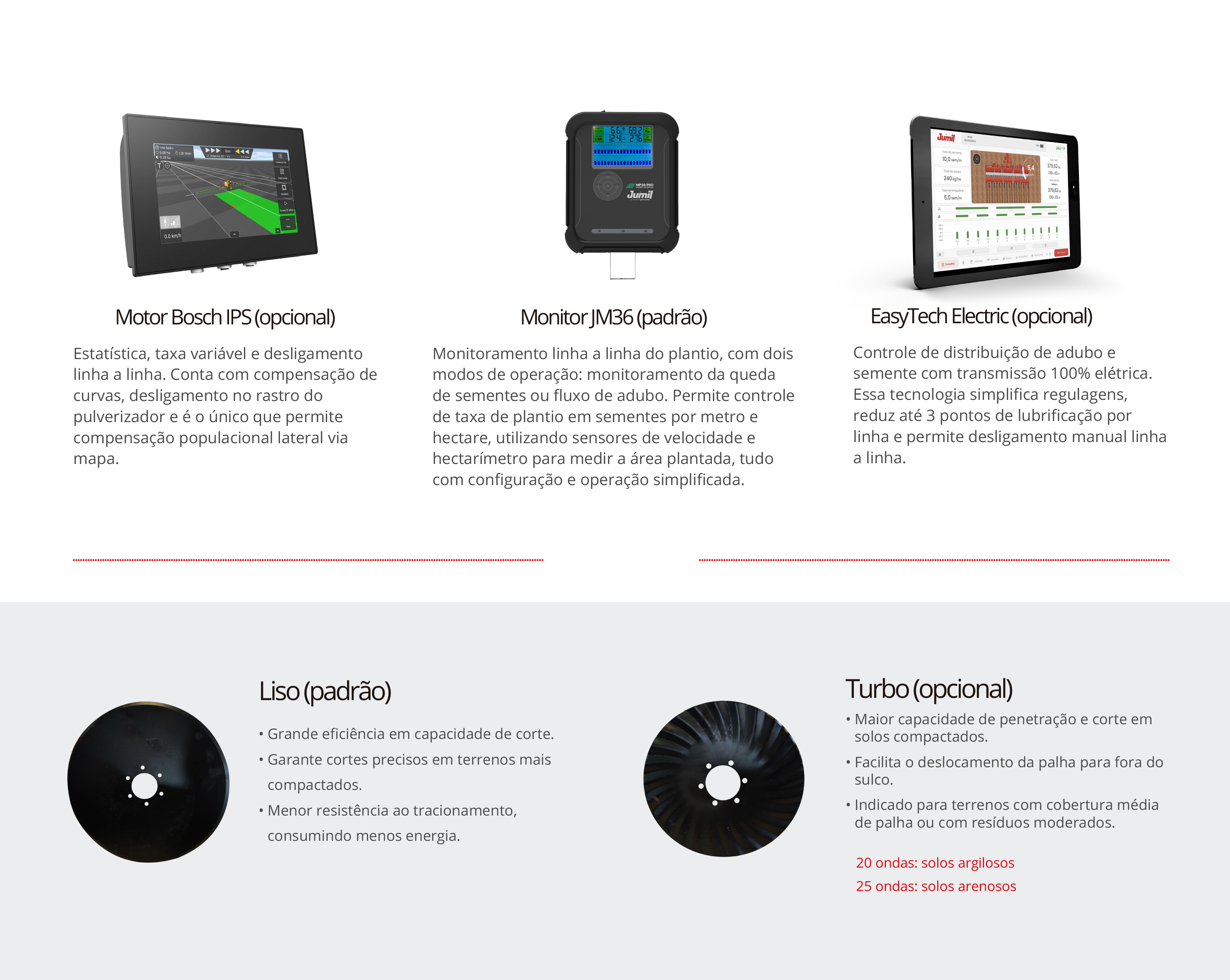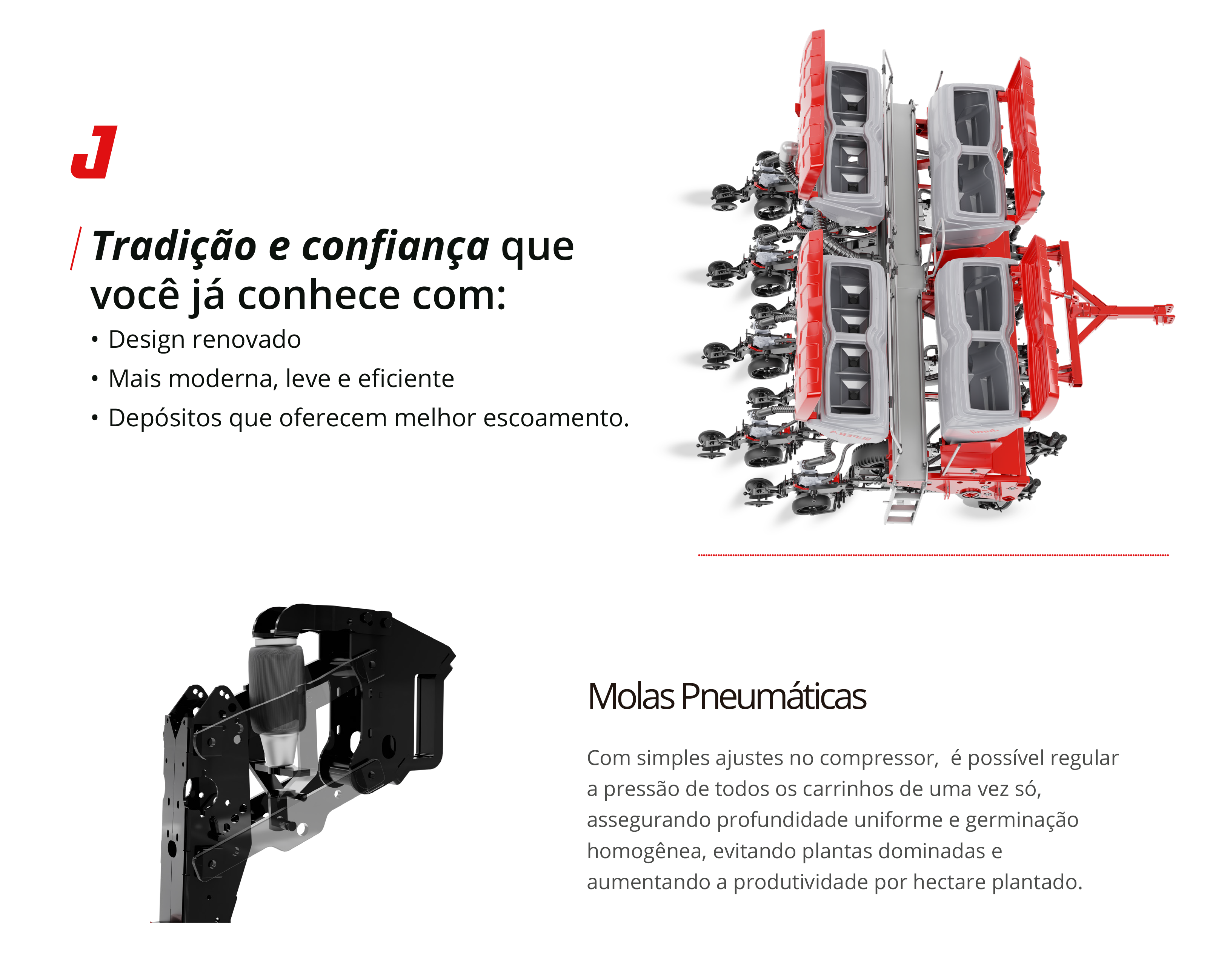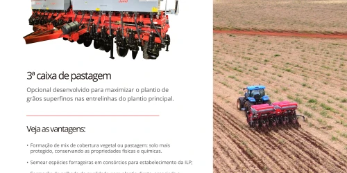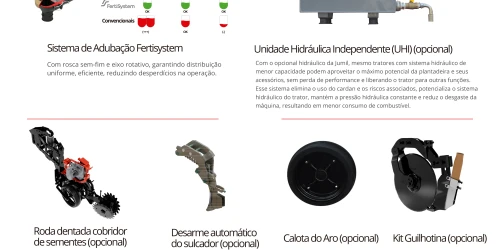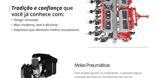 Com molas pneumáticas que proporcionam cópia eficiente do terreno, a Supera assegura profundidade uniforme das sementes e emergência mais homogênea das plantas. Versátil, está disponível em versões de 8 a 18 linhas, com sistema de distribuição de sementes mecânico ou pneumático Exacta Air, unindo tecnologia e precisão para mais eficiência e produtividade no campo.