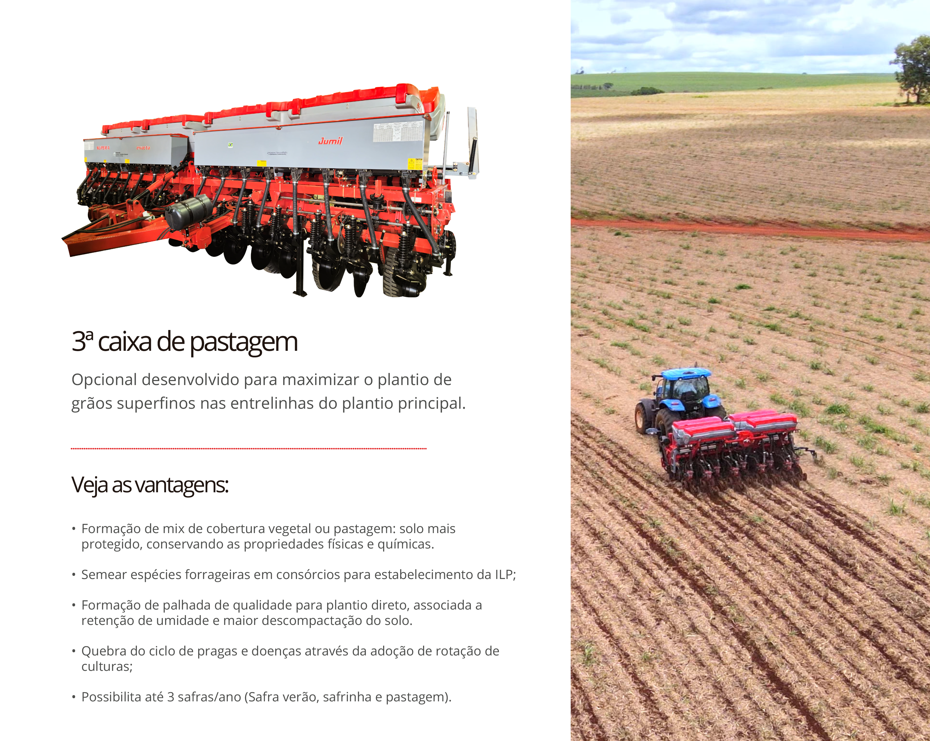 Desenvolvida para atender aos desafios do campo, a Supera é a nova plantadora adubadora da Jumil, equipada com depósitos de design inovador que aumentam a autonomia de trabalho e favorecem o melhor escoamento de adubo e sementes. Seus pantógrafos rolamentados garantem maior estabilidade das linhas de plantio, além de oferecer maior durabilidade e menos pontos de lubrificação.