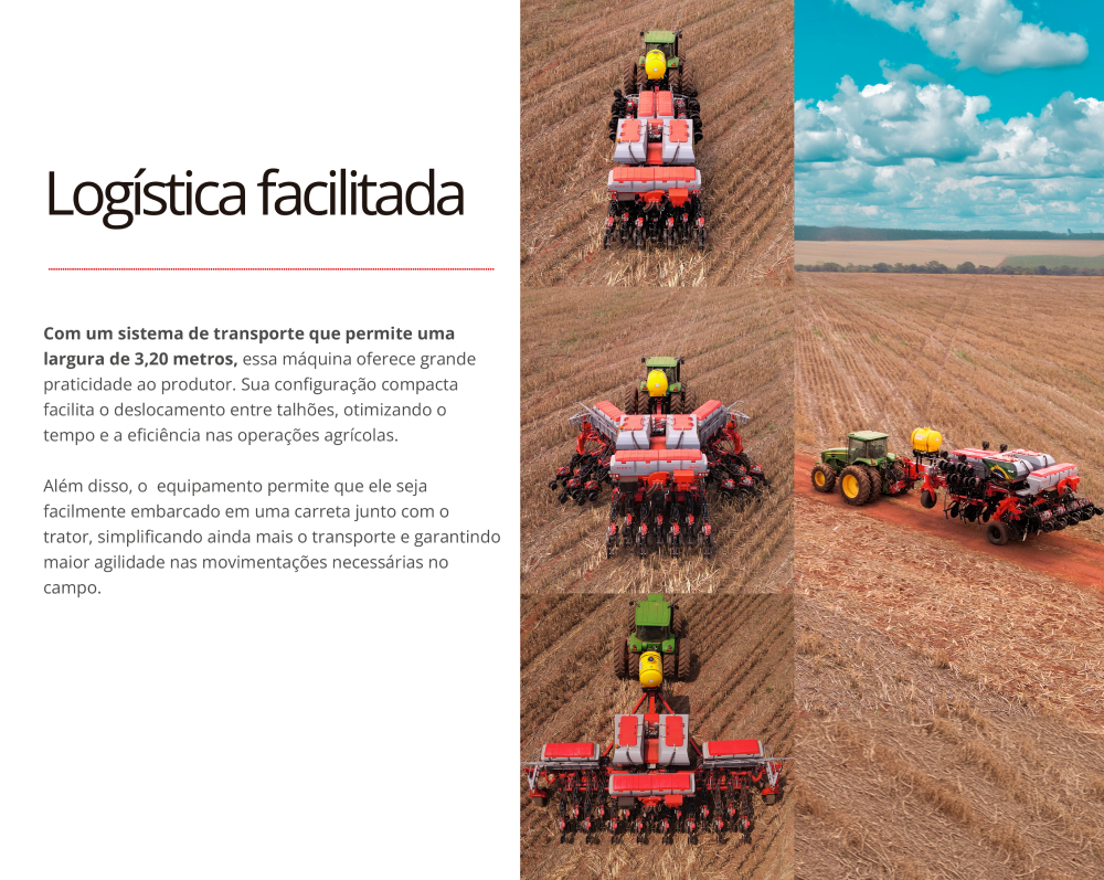 Para maior eficiência operacional, conta com depósito central de sementes pressurizado, que agiliza o abastecimento, e depósito longitudinal de fertilizantes, que melhora a distribuição de peso e o poder de corte. Além disso, possui menos pontos de lubrificação, facilitando a manutenção, e sistema de fechamento rápido em 3,20 m, que torna o transporte e as manobras entre talhões mais ágeis.