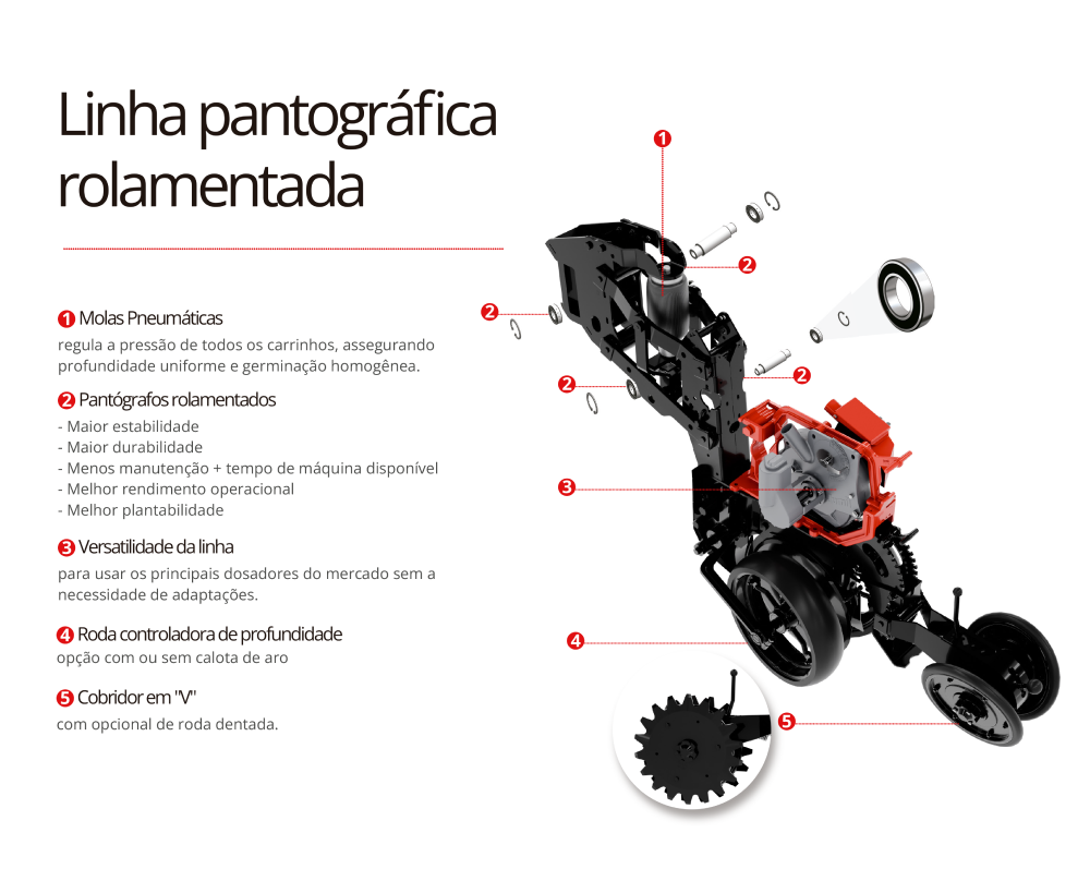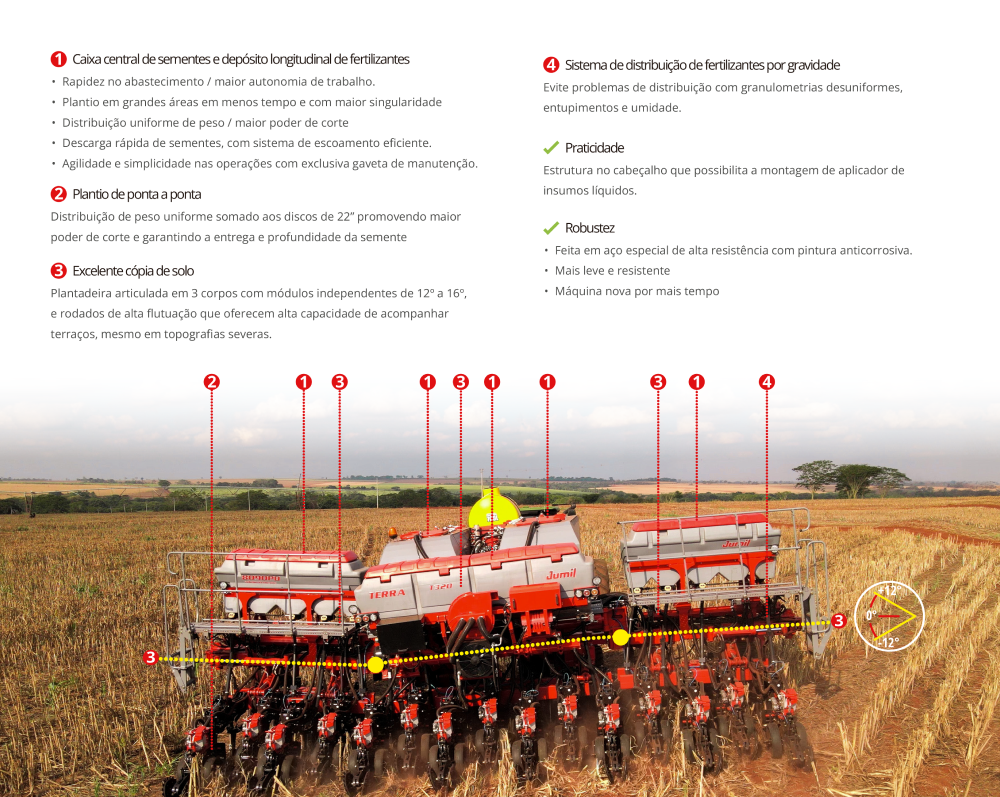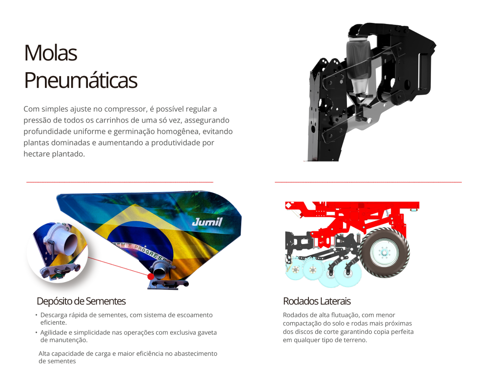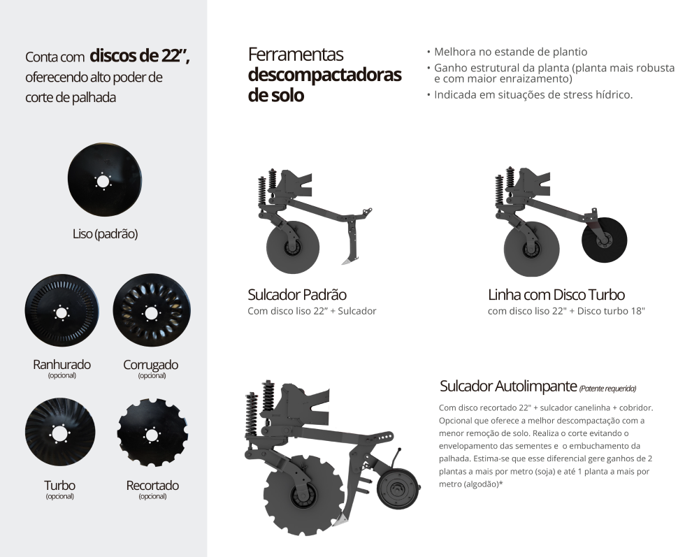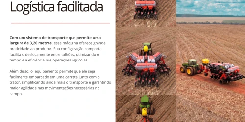 Para maior eficiência operacional, conta com depósito central de sementes pressurizado, que agiliza o abastecimento, e depósito longitudinal de fertilizantes, que melhora a distribuição de peso e o poder de corte. Além disso, possui menos pontos de lubrificação, facilitando a manutenção, e sistema de fechamento rápido em 3,20 m, que torna o transporte e as manobras entre talhões mais ágeis.